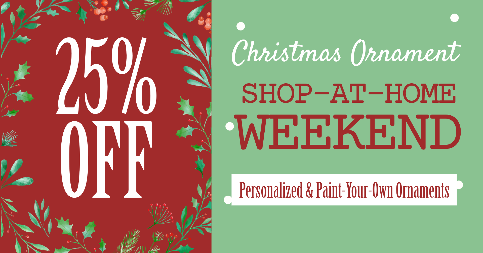 25% off all Personalized or Paint-Your-Own Ornaments this weekend! Discounts are applied in the shopping cart.