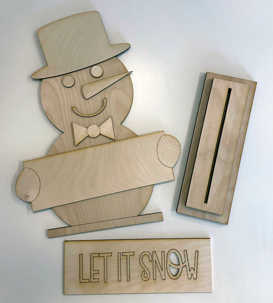 Decoración de estante con muñeco de nieve "Let it Snow" - Kit de madera listo para pintar