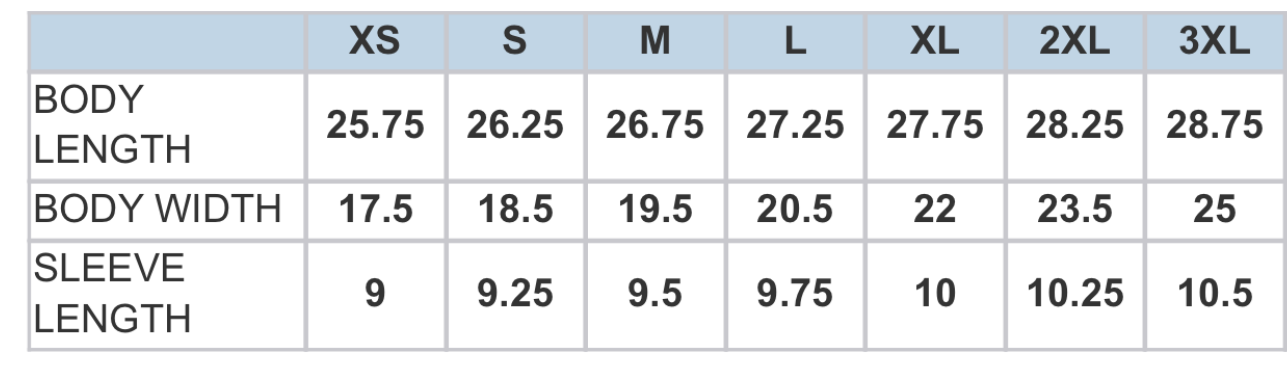 | Chest Width (Laid Flat) | 17 1/2 | 18 1/2 | 19 1/2 | 20 1/2 | 22 | 23 1/2 | 25 |