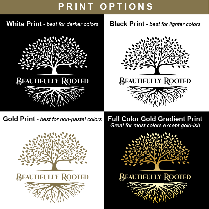 Your choice of shirt color and print color (white, gold, black, or shown: full-color gold gradient)