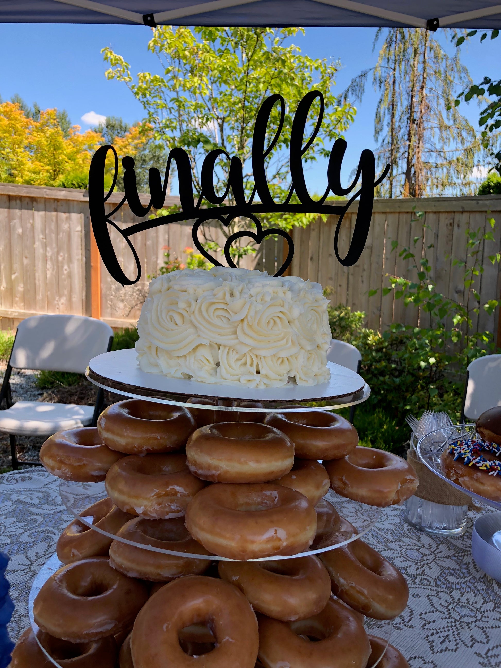 They are made using the highest quality wood or acrylic and each topper is laser cut once the artwork is approved. The general size is 6" wide unless another size is requested. Cake toppers have skewers as part of the design or come with skewers as an add on and are ready to pop straight into your cake.