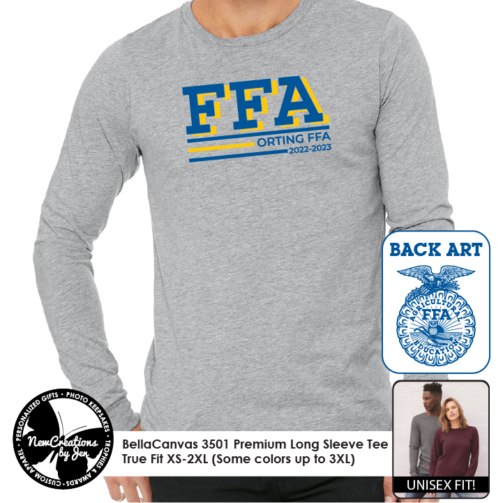 True comfy unisex fit that's a favorite by men and women alike! Price includes your choice of Orting FFA Artwork and will adjust once you pick your size, shirt color, and artwork option.
